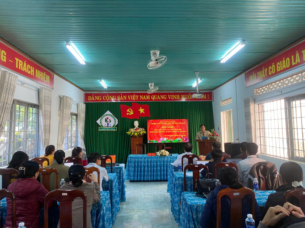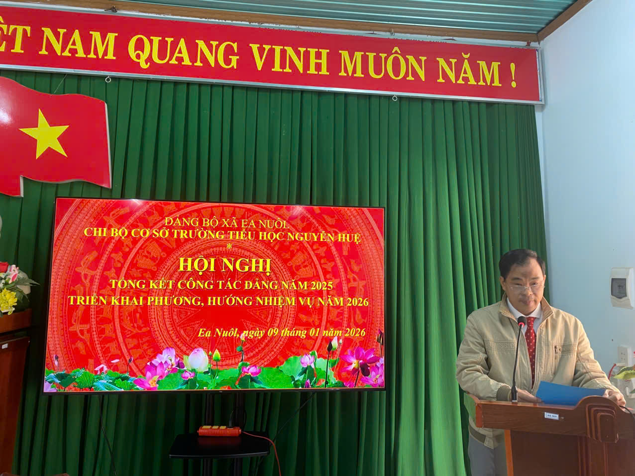 Mở đầu hội nghị, thay mặt Đoàn chủ tịch, đồng chí Cao Văn Hạnh – Phó Bí thư chi bộ đã thông qua dự thảo báo cáo tổng kết công tác Đảng năm 2025. Năm 2025, Chi bộ cơ sở trường Tiểu học Nguyễn Huệ đã thể hiện xuất sắc vai trò “hạt nhân” chính trị, lãnh đạo đơn vị hoàn thành 100% các chỉ tiêu đề ra. Sự chỉ đạo quyết liệt của Chi bộ đã thẩm thấu vào từng hoạt động chuyên môn, tạo nên những chuyển biến tích cực về chất lượng giáo dục. Các hoạt động phong trào của nhà trường không chỉ dừng lại ở bề nổi mà đã đi vào chiều sâu. Đây là minh chứng cho sự gương mẫu và tinh thần “đảng viên đi trước” cũng như nỗ lực không ngừng nghỉ của tập thể sư phạm nhà trường.