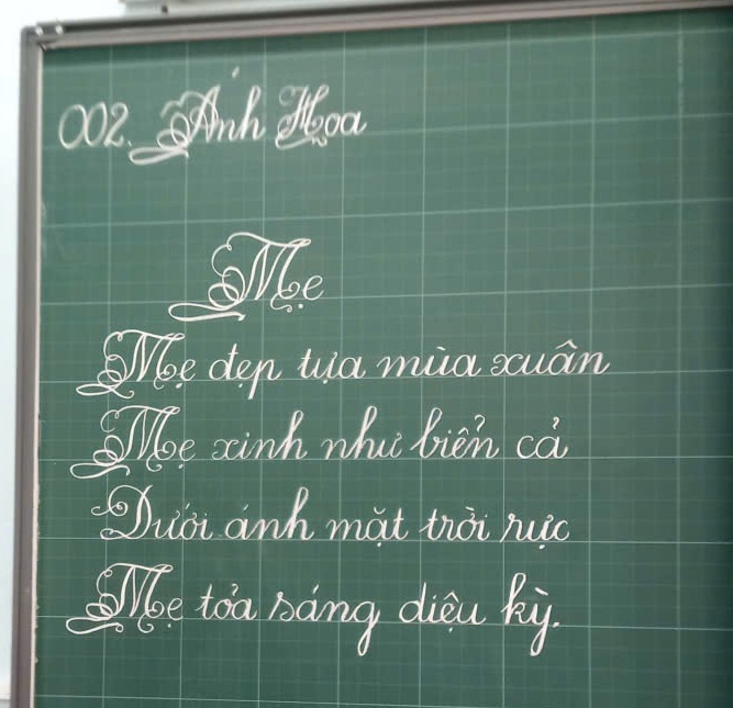 Nếu như bài thi trên giấy đòi hỏi sự tinh tế, nắn nót trong từng đoạn văn, vần thơ theo kiểu chữ đứng nét đều hoặc thanh đậm, thì bài viết bảng lại là “đất diễn” để các thầy cô phô diễn sự tài hoa qua kiểu chữ nghiêng sáng tạo. Chính sự kết hợp giữa kỹ thuật điêu luyện và thẩm mỹ đã biến mỗi bài thi thành một tác phẩm nghệ thuật, gửi gắm trọn vẹn tâm huyết của người thầy trên từng trang giấy trắng và nền bảng xanh.