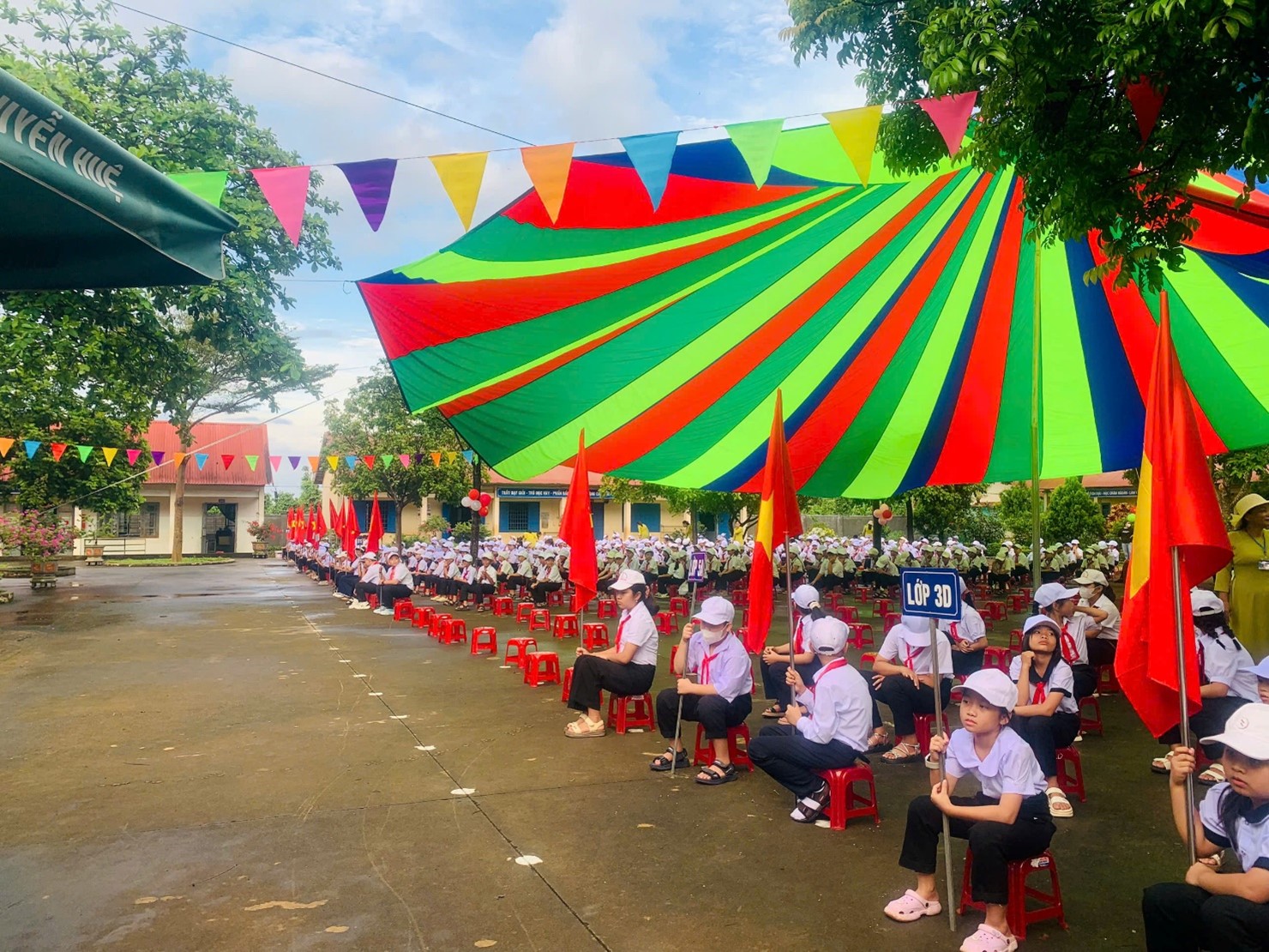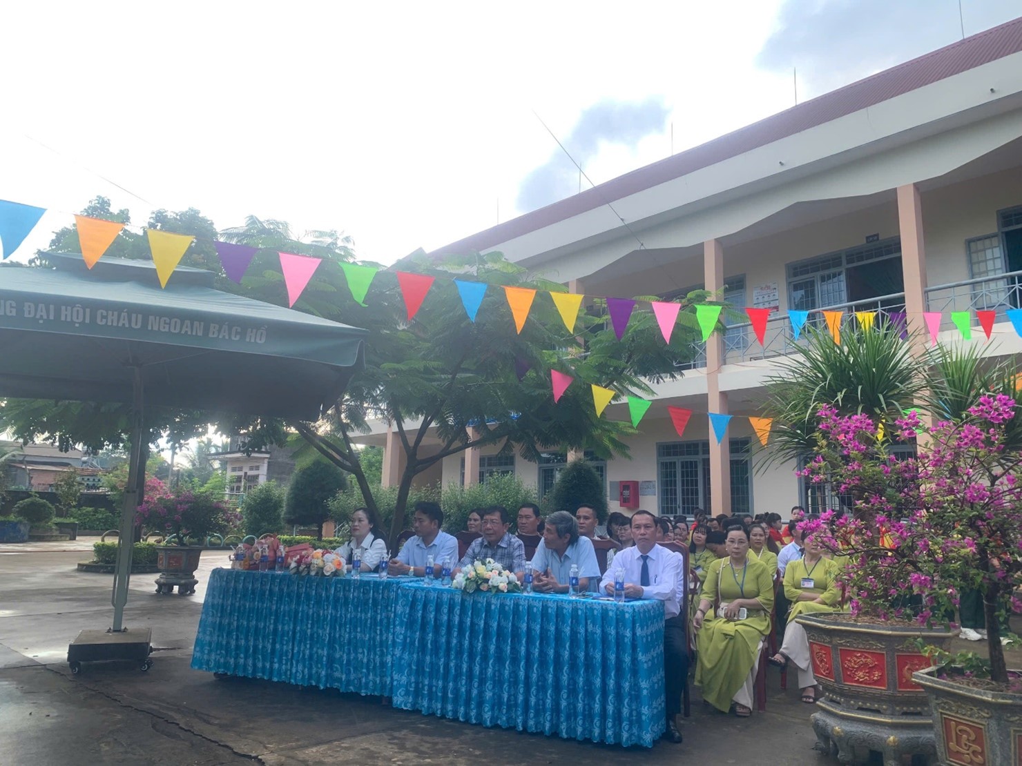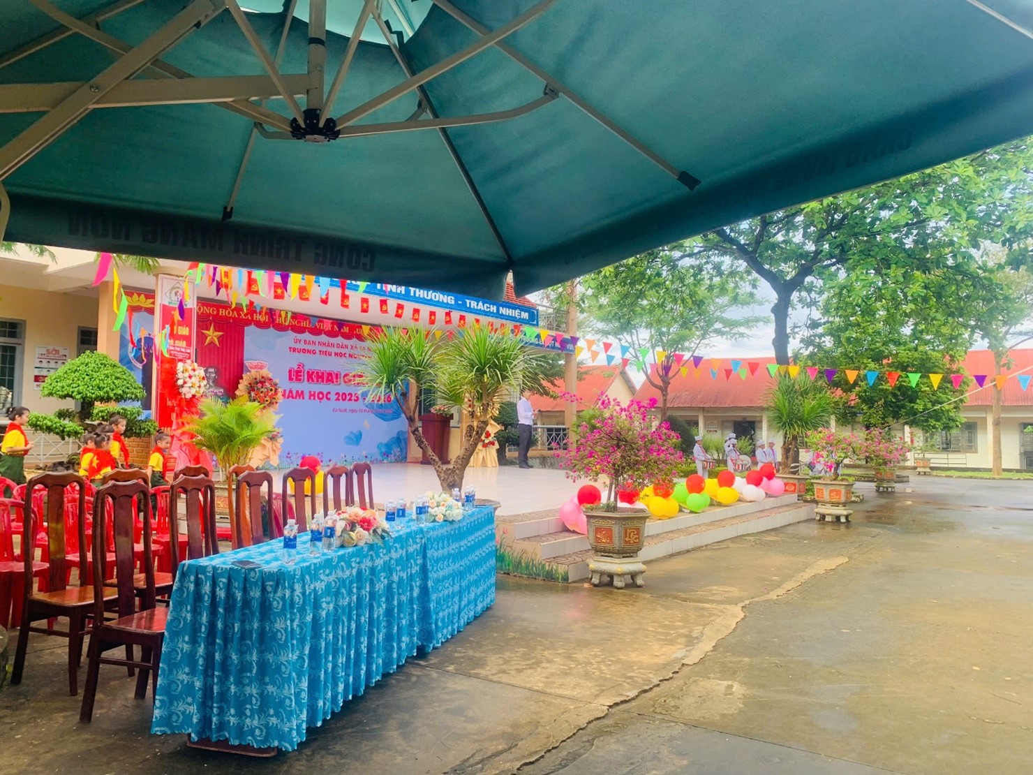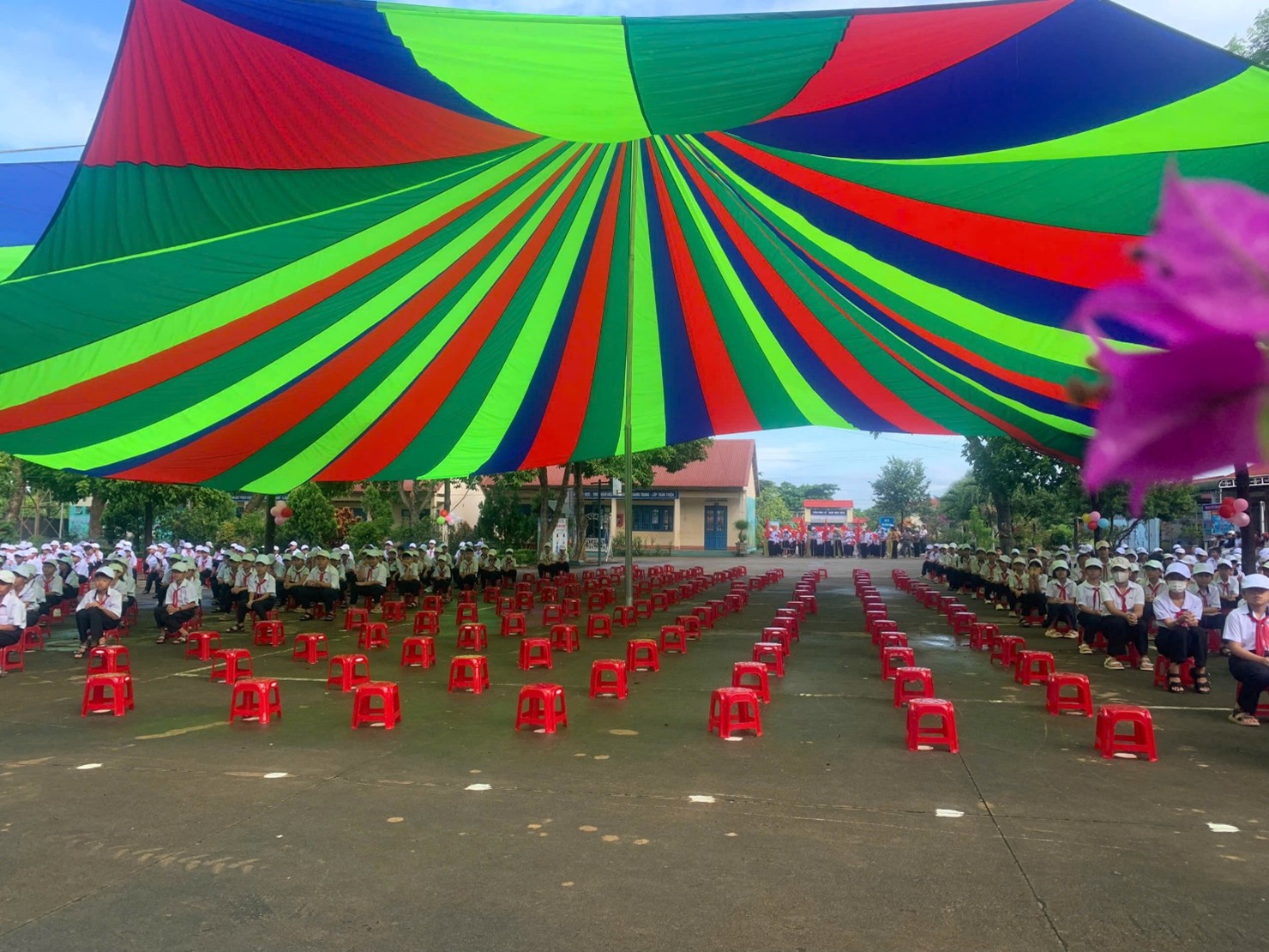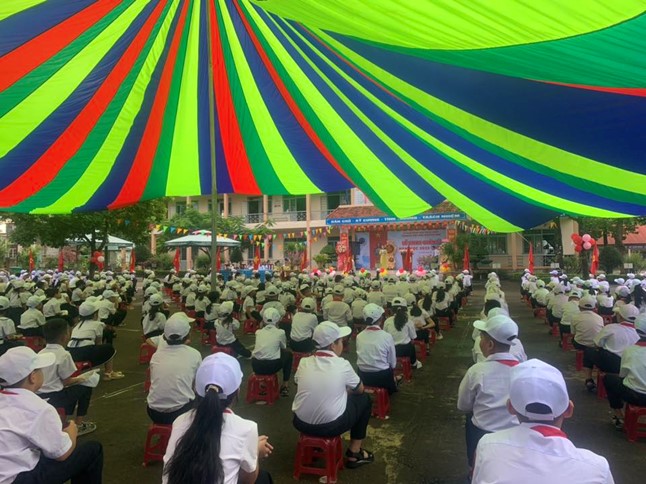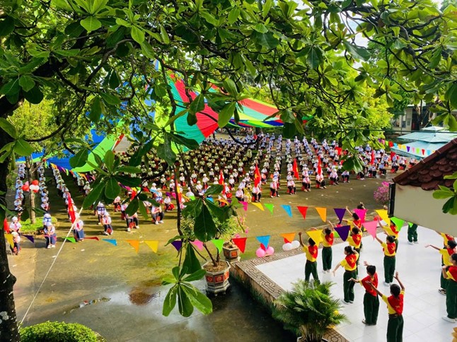 Khuôn viên nhà trường đã rực rỡ cờ hoa, tràn ngập sắc màu và tiếng cười nói rộn ràng. Phần chương trình văn nghệ chào mừng do các em học sinh biểu diễn đã mở đầu buổi lễ trong bầu không khí tươi vui, phấn khởi.