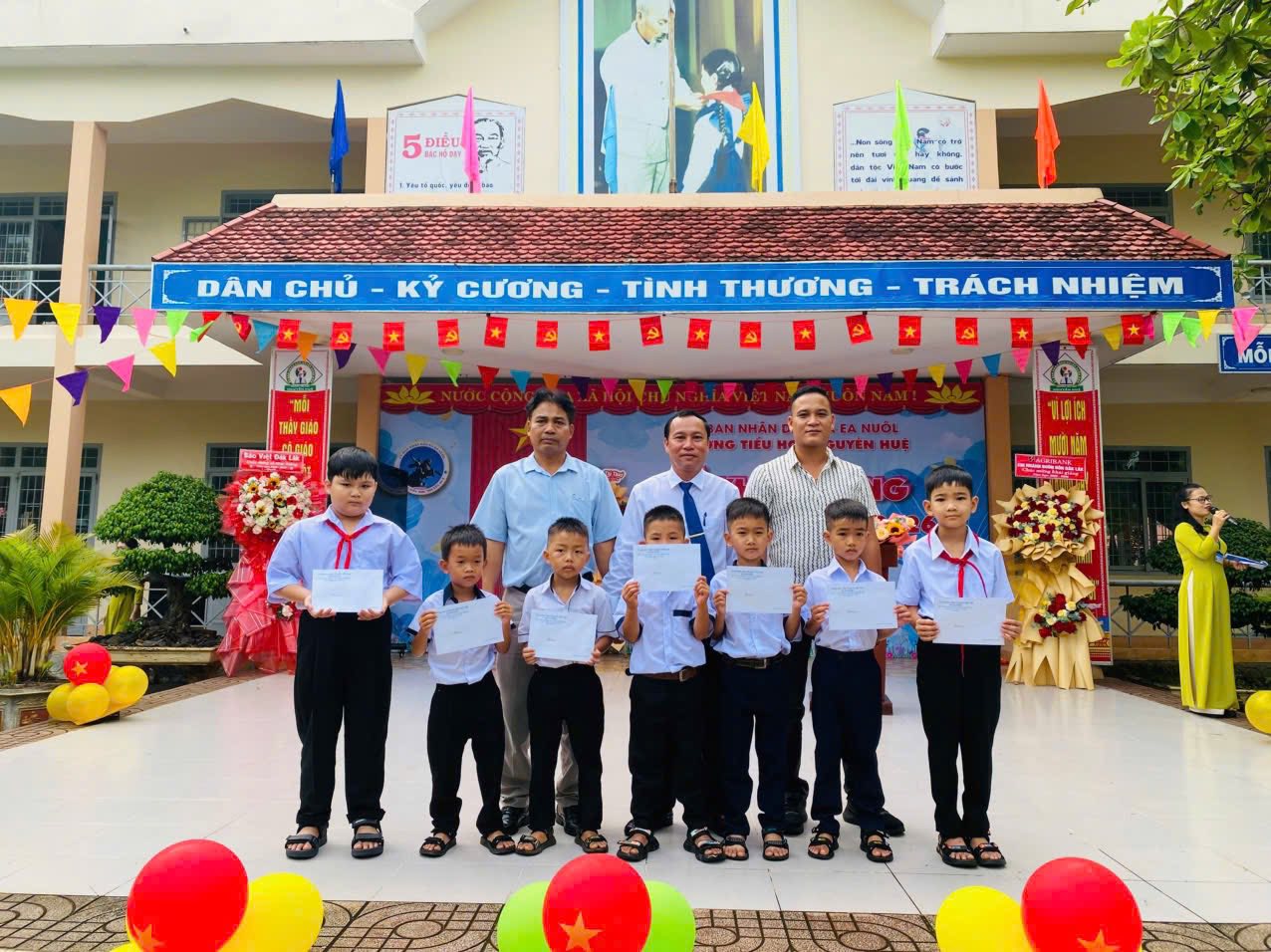 Đặc biệt, buổi lễ càng thêm ý nghĩa khi ông Lê Văn Hùng – mạnh thường quân thôn 5 đã trao tặng năm phần quà thiết thực đến các em học sinh có hoàn cảnh khó khăn. Những món quà ấy không chỉ hỗ trợ các em trước thềm năm học mới mà còn là nguồn động viên to lớn, khích lệ tinh thần vượt khó, nuôi dưỡng ước mơ và nghị lực vươn lên trong học tập. Cử chỉ đầy nhân văn của ông đã góp phần làm cho buổi lễ thêm phần ý nghĩa, thể hiện sự gắn kết giữa nhà trường với cộng đồng, giữa giáo dục và tình người.