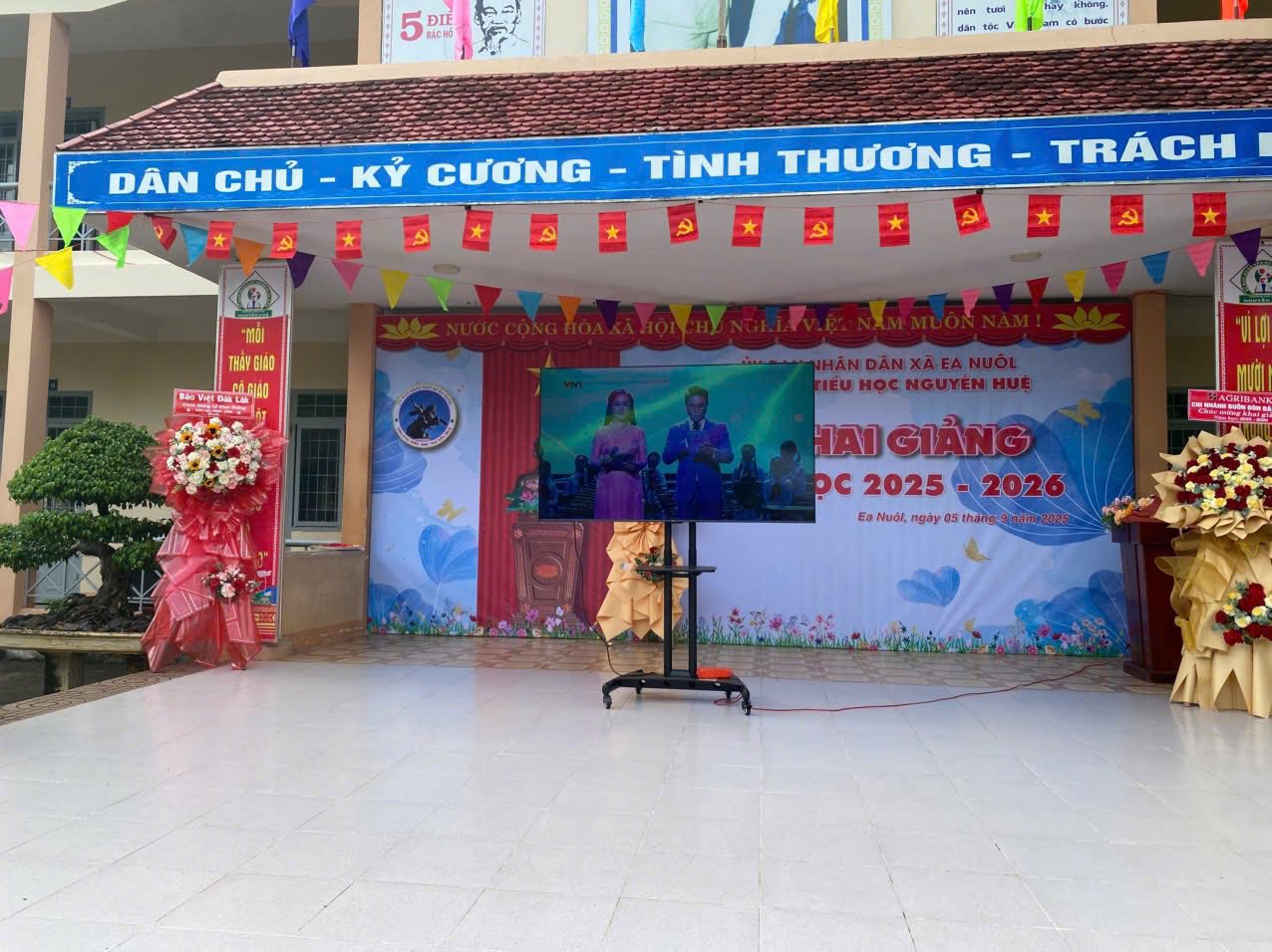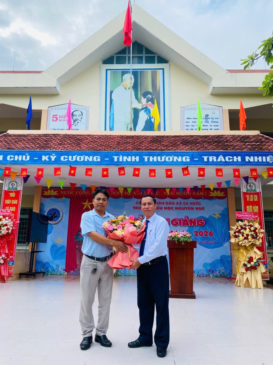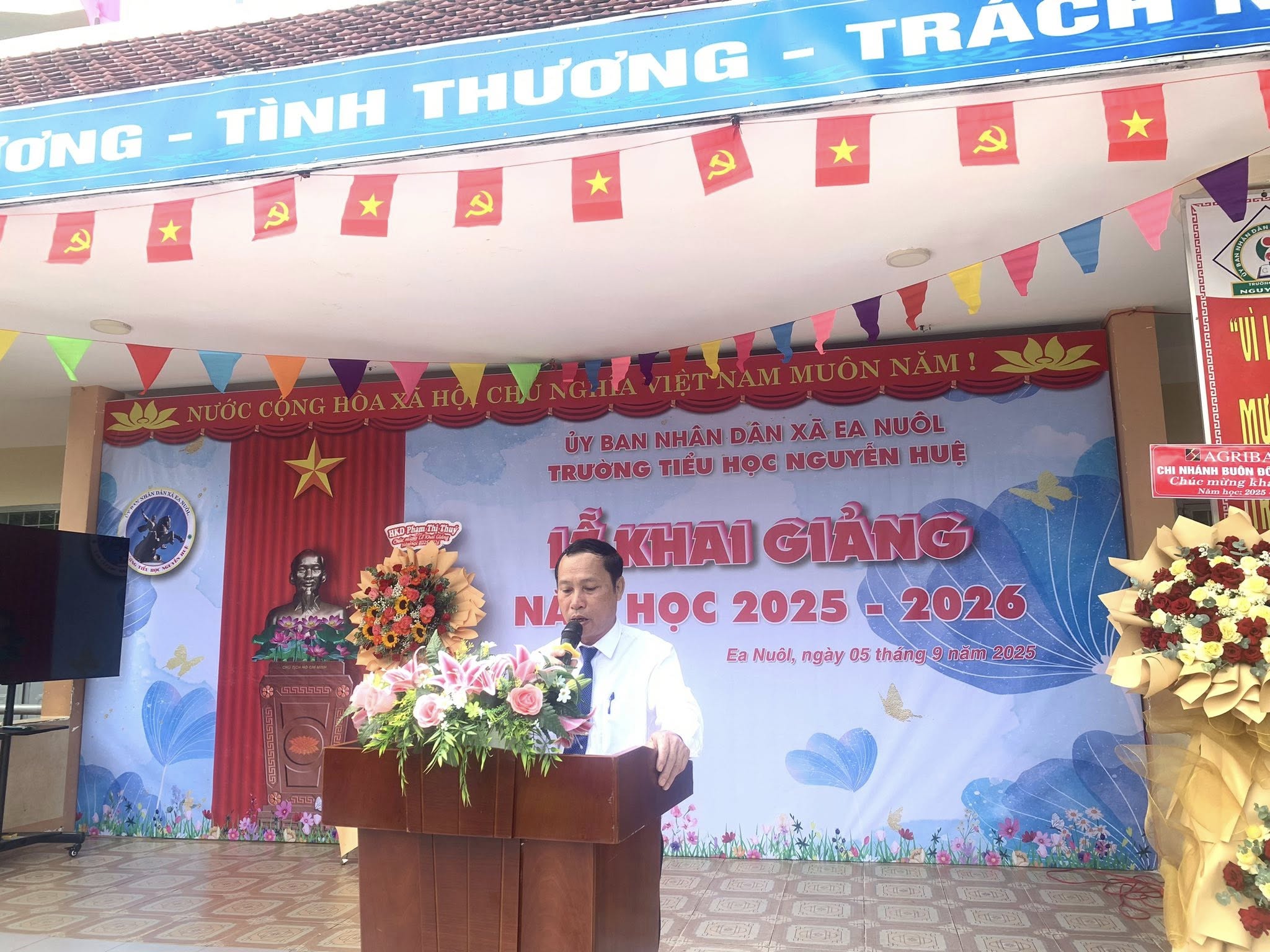 Sau đó, ông Y Sen Kbuôr – Thường vụ Đảng ủy, Chủ tịch Ủy ban Mặt trận Tổ quốc Việt Nam xã, đã thay mặt lãnh đạo địa phương lên sân khấu, trao lẵng hoa tươi thắm chúc mừng thầy và trò nhà trường. Bó hoa là lời chúc mừng, đồng thời cũng là niềm tin, kỳ vọng vào một năm học mới nhiều thành công và gặt hái nhiều thành tích.