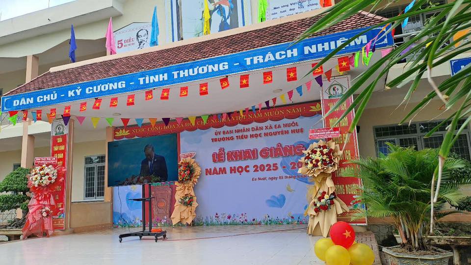 Về dự với buổi Lễ khai giảng năm học 2025-2026 có đồng chí Y Sen Kbuôr – Thường vụ Đảng ủy, Chủ tịch Ủy ban Mặt trận Tổ quốc Việt Nam xã; các đồng chí đại diện cho chính quyền địa phươn; Ban đại diện Hội cha mẹ học sinh của trường; ông Lê Văn Hùng – Mạnh thường quân thôn 5 đã đến tham dự và chung vui với thầy và trò Trường Tiểu học Nguyễn Huệ.